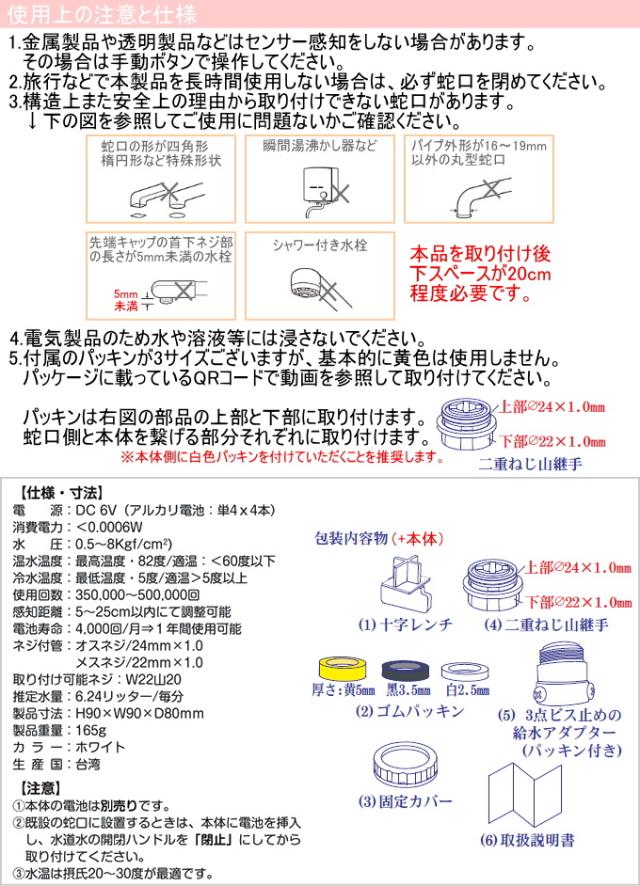 | 注意事項 | 電池は別売りです。 水温は摂氏20〜30度が最適です 蛇口の種類によっては取り付けできないため、画像をよくご確認ください。 ※イメージ画像は設置後の画像のため、蛇口は付属していません。 節水効果があるため、本品を取り付けると通常ご使用時に比べて流量は小さくなります。(水の出る量が多少少なくなります) 【リセットについて】 感知する対象物がないのに水が止まらない、勝手に水が出るなどおかしな症状が出てしまう場合、一度設定をリセットしていただくとほぼ直ります。 ですので、このような場合は電池を4つすべて外し、1分程度時間をおいてから再度セットしなおしてください。 |