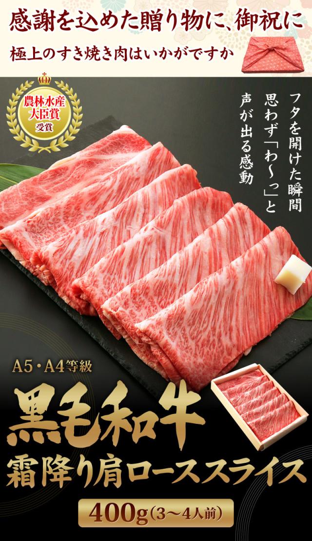 黒毛和牛 霜降り肩ローススライス 400グラム ギフト A5・A4等級 すき焼き肉 すき焼き お歳暮 しゃぶしゃぶ ギフト 和牛 お肉 牛肉 プレゼント 内祝い 御礼 お祝い 誕生日 冷凍
