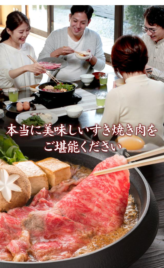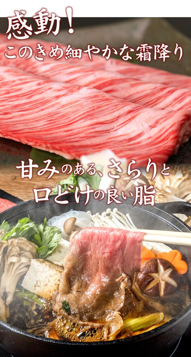 A5・A4黒毛和牛の高級部位、肩ロースをスライス。霜降りのやわらかな食感と濃厚な味わいが特徴で、すき焼きやしゃぶしゃぶにお薦めです。