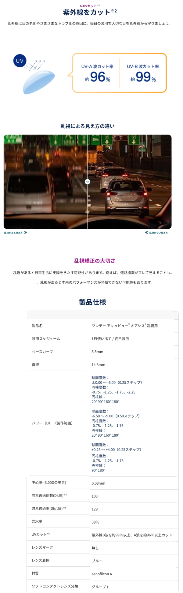 ・球面度数=±0.00〜-6.00(0.25ステップ)/円柱度数=-0.75、-1.25、-1.75、-2.25/円柱軸=90° 180°