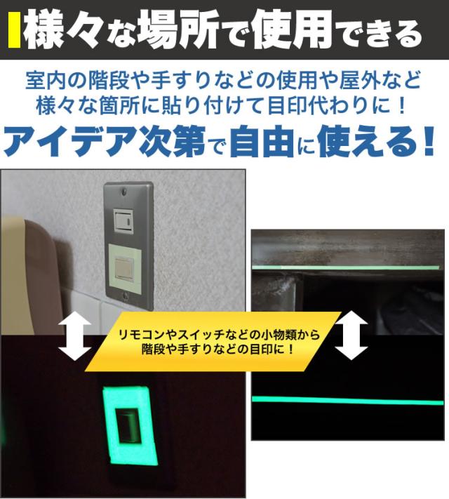 - 暗い階段に目印を!蓄光のテープを購入しました。 量も多くてセロハンテープのように好きなところに 貼れて使用できるので便利です。 蓄光が続くことを願います。