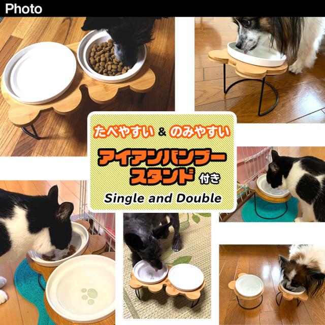 高さのあるペット用エサ皿♪ネコちゃん、ワンちゃんが首を下に曲げずにエサを食べられるから、ペットの首や腰への負担を軽減します。高さのあるアイアンバンブースタンド付きです。