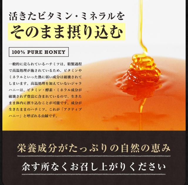 - クセが無くて食べやすく、在庫が 切れそうだったので、購入しました マヌカハニーも美味しいですが、 ジャラハニーは黒糖に近い味で 家族が気に入っています。 迅速な対応ありがとうございました