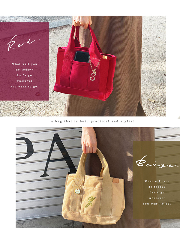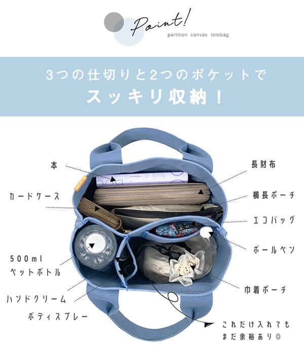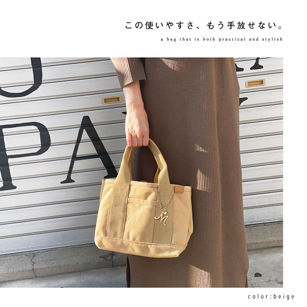 3つの仕切りと2つのポケットでスッキリ収納できるミニトートバッグ。