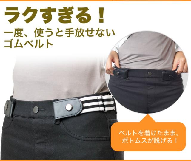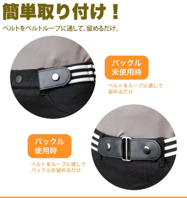 ベルトループ(ベルト通し)にゴムベルトの両端をパチンと留めるだけ。