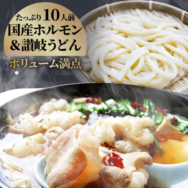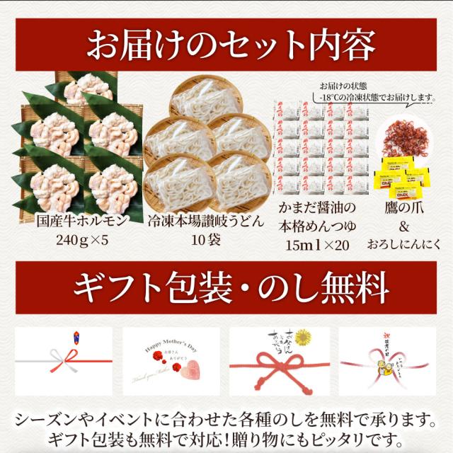 国産牛ホルモン(小腸)1200g、冷凍讃岐うどん×10、鎌田醤油の濃縮めんつゆ15ml×20、おろしにんにく3g×10、鷹の爪