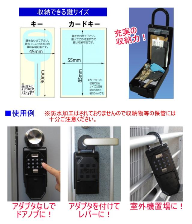 | 特徴 | 暗証番号を「数字」と「位置」で覚えられますので、大切な暗証番号を忘れにくく、暗い場所でもご使用しやすくなっています。 ※ご使用される方によって個人差がございます。 ボタンは12個配列で見やすく押しやすい設計。 ボタン保護用カバー付きなのでボタン操作時以外は、カバーで雨・風・ホコリから操作部分を守ります。 大容量の収納力!一度に複数の鍵を収納できます。(カードキーも可) 暗証番号は可変式で、1桁から12桁までお好きな番号に設定できます。(4000通り以上) レバーハンドル用アダプター付きなのでレバータイプにも取り付け可能。 設置場所が「ドアノブ等に引っかけて」の取付と「壁にビス止め」での取付の2通り選べます。 伝言メモ紙など収納物の一時保管・受け渡しに。(防水加工はしておりません。) |