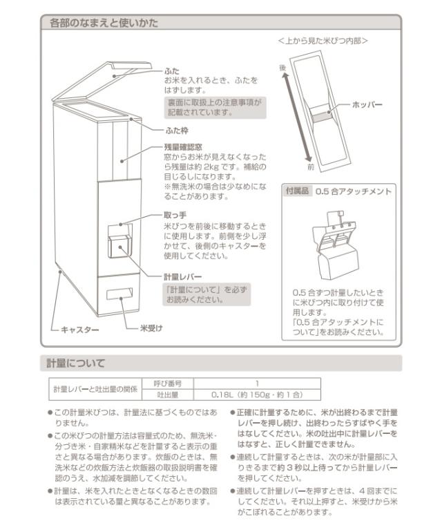 | 材質 | 本体:鋼板(樹脂焼付塗装) ふた・米受け・計量部・残量確認窓:ポリスチレン 背面支柱・アタッチメント:ポロプロピレン |