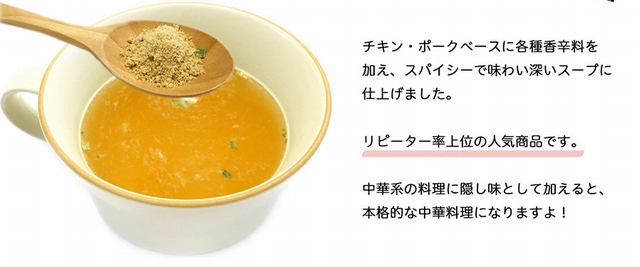 チキン・ポークベースに各種の香辛料を加え、 スパイシーで味わい深く仕上げたスープです。 リピーター率の高い人気商品!春雨や肉だんごを プラスすれば本格春雨スープに!! スープとして味わうだけでなく、隠し味として チャーハンや野菜炒めに使うと本格的な 中華料理に仕上がります