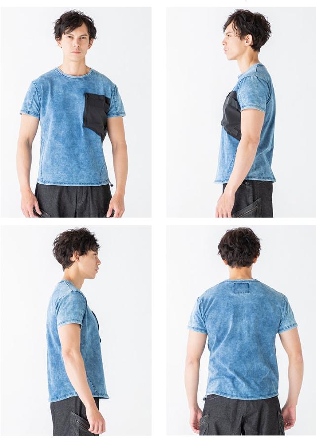 左胸に異素材のファスナーポケットがついた風合いの良いデニムニットの半袖Tシャツ。