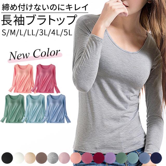 カップ付き 長袖 プラトップ 大きいサイズ レディース あったか 肌着 インナー tシャツ 丸首 さらさら 薄手 締め付けない 黒 白 赤 青 水色 緑 紫 冬 rr66 プレゼント ギフト 母の日 父の日 敬老の日 バレンタイン ホワイトデー クリスマス