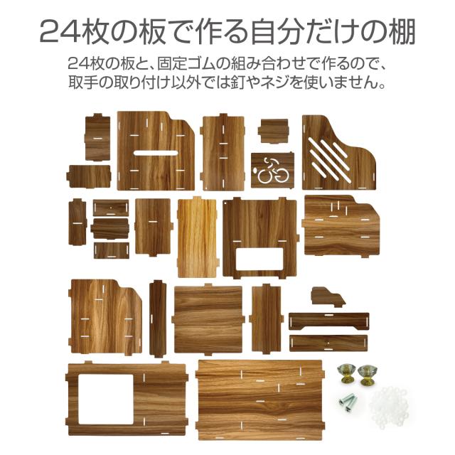 24枚の板と、固定ゴムの組み合わせで作るので、取手の取り付け以外では釘やネジは使いません。