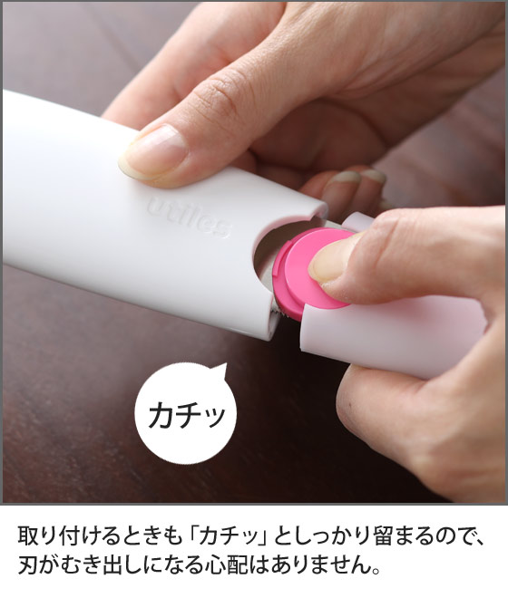 カバーは真ん中のボタンを押すと外れる仕組み。取り付けるときも「カチッ」としっかり留まるので、刃がむき出しになる心配はありません。