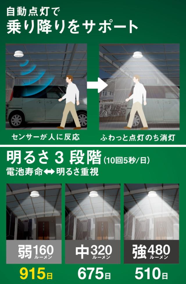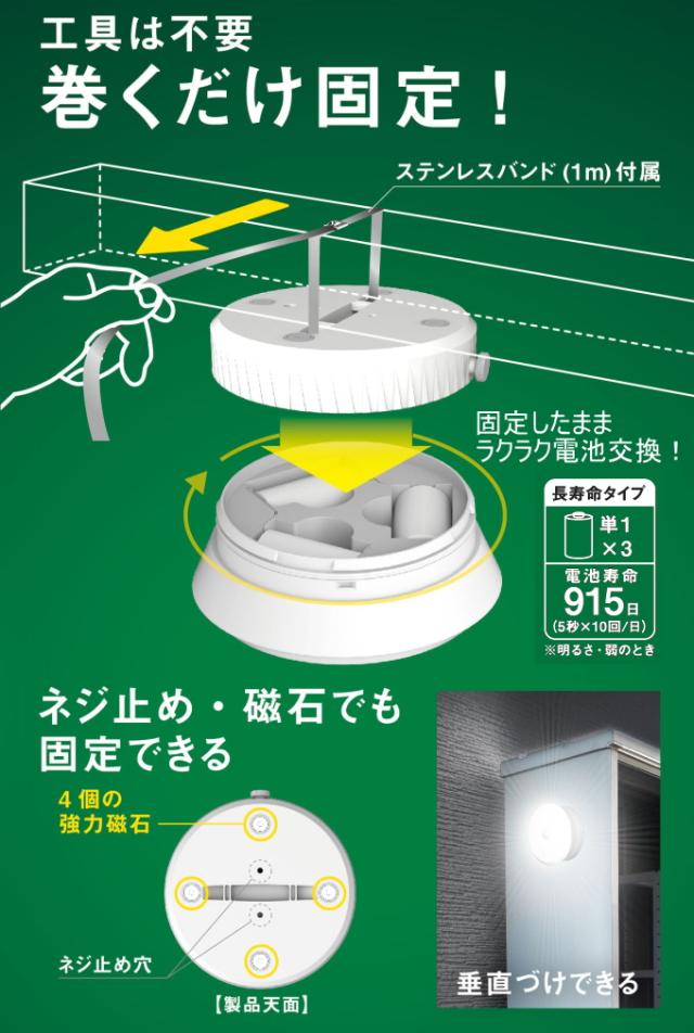 | 特徴 | カーポートに最適な乾電池式屋外用センサーシーリングライト、リモコン付きの高機能タイプです。 人が近づくと自動で点灯。360°広範囲が明るく、車の乗り降りをサポートします。 点灯設定は2種類。人に感知して点灯するセンサーモード、つきっぱなしの投光器モード。 その他にも、3段階の明るさ調整、4段階の点灯時間設定などリモコンで様々な設定ができます。 取り付けも簡単!付属のステンレスバンドで引っ張るだけで固定できます。 また製品天面に4個の強力磁石を内蔵。倉庫の側面に垂直付けもできます。 ネジ止めも可能です。 電池ボックスを回して取り外し、固定したままラクに電池交換が可能。 取扱説明書をよくお読みになり、正しく取付けてください。 |