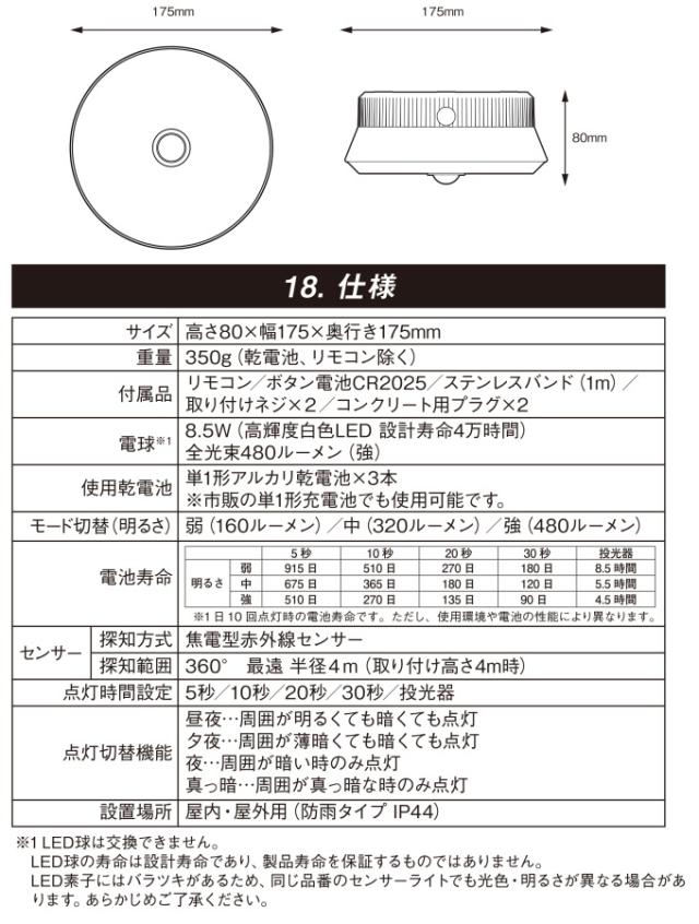 | センサー | 探知方式:焦電型赤外線センサー 探知範囲:360°最遠半径4m ※取付高さ4m |