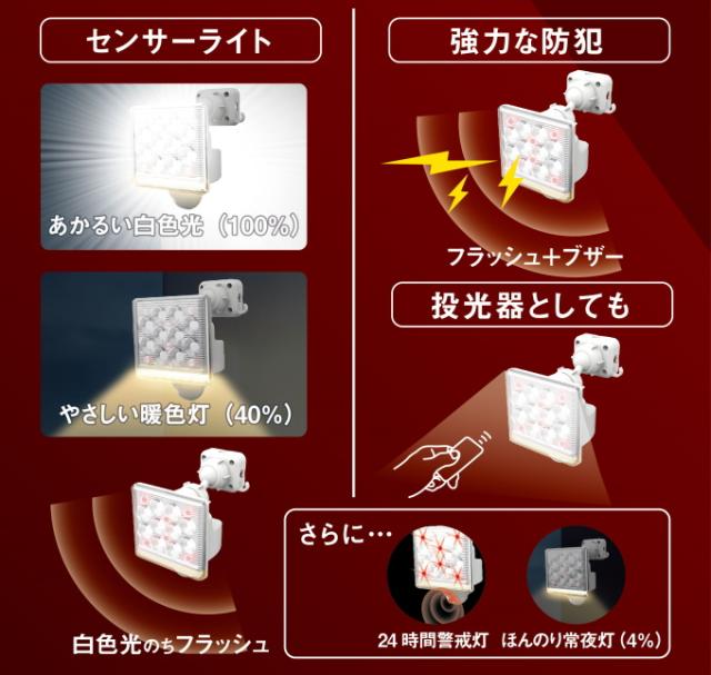 | 特徴 | リモコン操作ができるコンセント式LEDセンサーライトです。 遠隔操作で家にいながら外に設置したセンサーライトを操作!(本体から3m以内で操作してください。) 白色光・暖色灯のほかに、防犯対策に最適なフラッシュ発光・さらに撃退モード・投光器モードも搭載。 撃退モードは昼夜問わず人が近づくとフラッシュ発光+ブザー音で威嚇。より強力な防犯対策ができます。 ライトは自由に動くフリーアーム式。好きな方向を照らせます。 取り付け簡単。ネジ止め、付属のクランプで挟んで固定できます。 取扱説明書をよくお読みになり、正しく取付けてください。 |