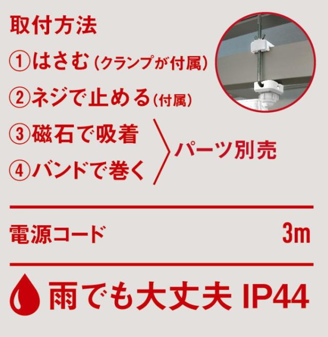 | 設置場所 | 屋内・屋外用(防雨タイプIP44) ※水中・暴風での使用はしないでください。 |