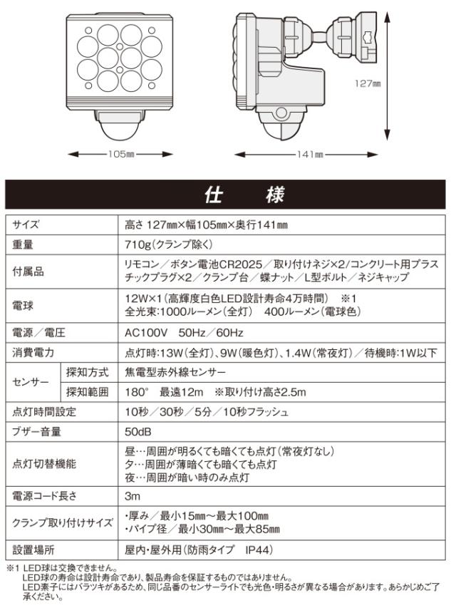 | 電球 | 12W×1 高輝度LED(設計寿命4万時間) 全光束…約1000ルーメン(白色)、400ルーメン(電球色) ※LED球は交換できません。表示はLED球の設計寿命であり、製品寿命を保証するものではありません。 LED素子にはバラツキがあるため、同じ品番のセンサーライトでも光色・明るさが異なる場合があります。あらかじめご了承ください。 |