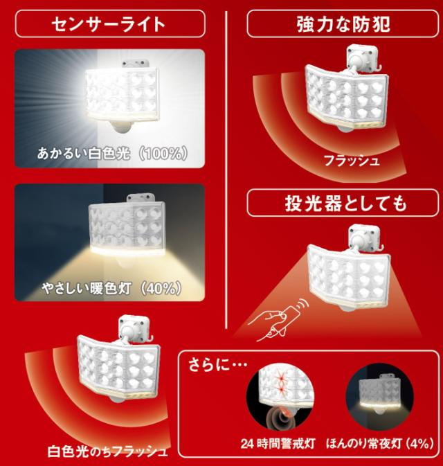 | 特徴 | リモコン操作ができる小型コンセント式LEDセンサーライトです。 遠隔操作で家にいながら外に設置したセンサーライトを操作!(本体から3m以内で操作してください。) 白色光・暖色灯のほかに、防犯対策に最適なフラッシュ発光・さらに撃退モード・投光器モードも搭載。 ライトは自由に動くフリーアーム式。好きな方向を照らせます。 取り付け簡単。ネジ止め、付属のクランプで挟んで固定できます。 取扱説明書をよくお読みになり、正しく取付けてください。 |