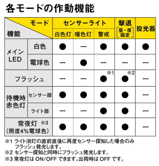 | 点灯切替え機能 | 昼:周囲が明るくても暗くても点灯(常夜灯なし) 夕:周囲が薄暗くても暗くても点灯 夜:周囲が暗い時のみ点灯 |