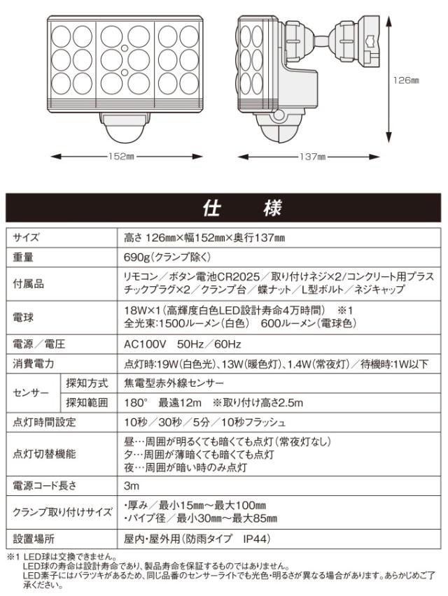| 電球 | 18W×1 高輝度LED(設計寿命4万時間) 全光束…約1500ルーメン(白色)600ルーメン(電球色) ※LED球は交換できません。表示はLED球の設計寿命であり、製品寿命を保証するものではありません。 LED素子にはバラツキがあるため、同じ品番のセンサーライトでも光色・明るさが異なる場合があります。あらかじめご了承ください。 |