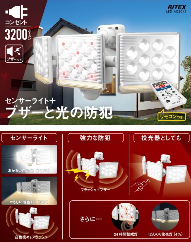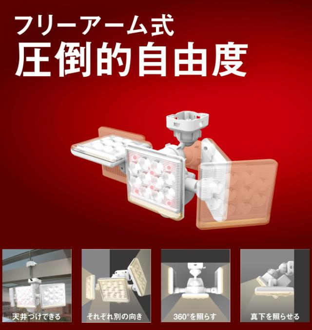 12W×3灯 フリーアーム式 LEDセンサーライト リモコン付 LED-AC3045 送料無料 屋内 屋外 コンセント式 遠隔操作 リモコン付 ブザー付 LED センサー ライト シンプル