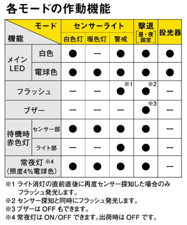 | 点灯切替え機能 | 昼:周囲が明るくても暗くても点灯(常夜灯なし) 夕:周囲が薄暗くても暗くても点灯 夜:周囲が暗い時のみ点灯 |