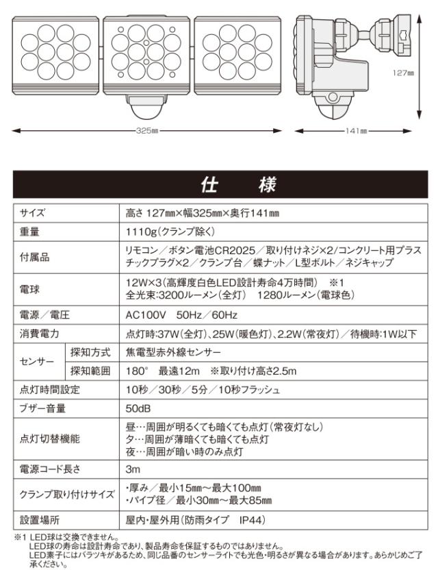 | 電球 | 12W×3 高輝度LED(設計寿命4万時間) 全光束…約3200ルーメン(全灯)、1280ルーメン(電球色) ※LED球は交換できません。表示はLED球の設計寿命であり、製品寿命を保証するものではありません。 LED素子にはバラツキがあるため、同じ品番のセンサーライトでも光色・明るさが異なる場合があります。あらかじめご了承ください。 |