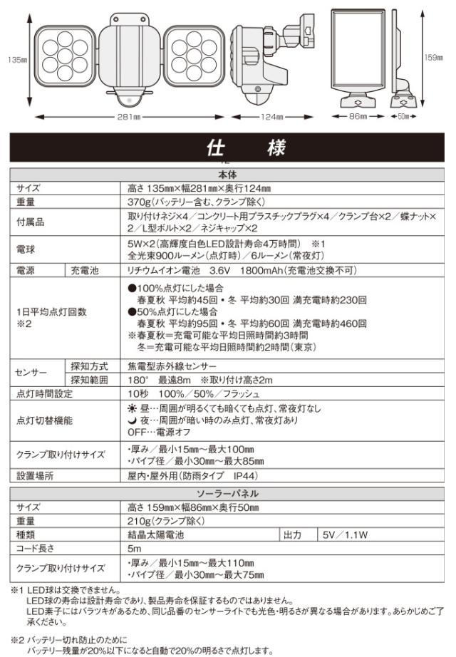 | 電球 | 電球種類:5W×2 高輝度白色LED (設計寿命4万時間) 全光束:約900ルーメン(点灯時)/6ルーメン(常夜灯) ※LED球は交換できません。表示はLED球の設計寿命であり、製品寿命を保証するものではありません。 LED素子にはバラツキがあるため、同じ品番のセンサーライトでも光色・明るさが異なる場合があります。あらかじめご了承ください。 |