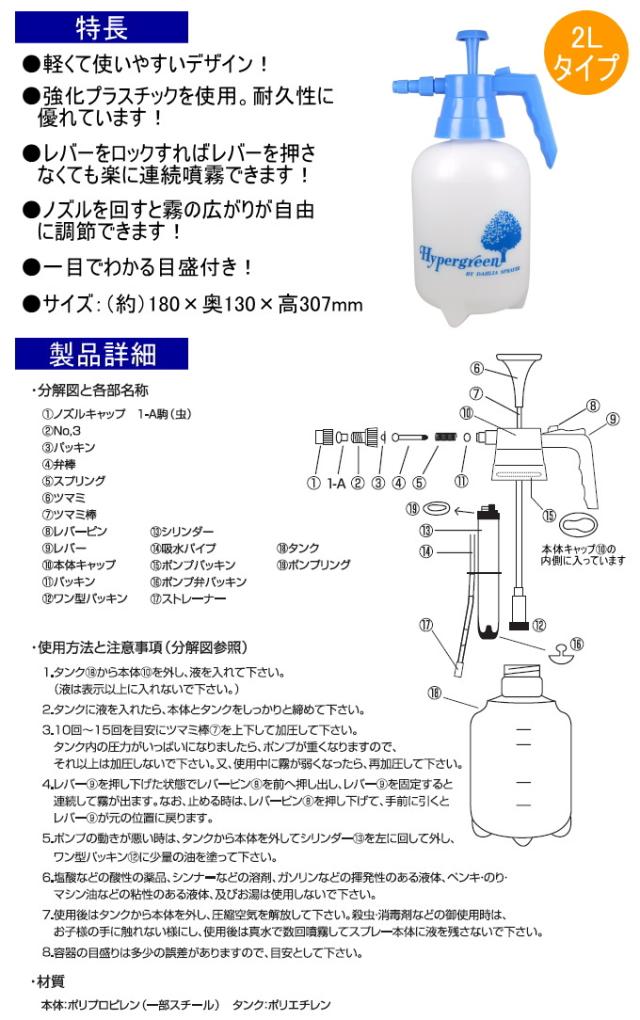 | 特徴 | 軽くて使いやすいデザイン。強化プラスチックを使用しておりますので耐久性に優れています。 レバーをロックすればレバーを押さなくても楽に連続噴霧できます。 ノズルを回すと霧の広がりが自由に調節できます。 アルコール消毒にも使えます。 ただし無水エタノールの場合は80%以下に薄めてください。 2Lタイプ。 |