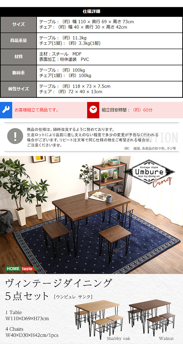 オブジェのようなアイアン脚 ヴィンテージ ダイニングテーブルセット 5点 / 4人 おしゃれ ウォールナット オーク ベンチ 4人掛け 4人用 安い 激安 コンパクト 小さい