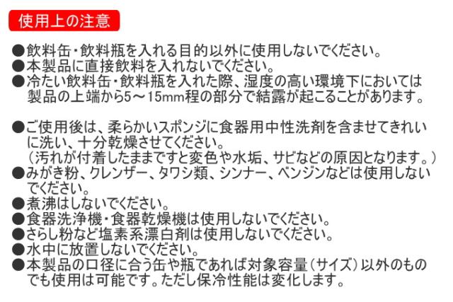 | 使用上の注意 | 飲料缶・瓶を入れる目的以外に使用しないでください。 本製品に直接飲料を入れないでください。 飲料缶・飲料瓶を入れたまま飲んだり、お酌などはしないでください。 冷たい缶・瓶を入れた際、湿度の高い環境下においては製品の上端から5〜15mm程の部分で結露が起こることがあります。 煮沸はしないでください。 食器洗浄機・食器乾燥機は使用しないでください。 お手入れの際、クレンザー、タワシ類、シンナー、ベンジンなどは使用しないでください。 斑点状の赤サビが付着した際は、食酢を10%加えたお湯を入れ、30分から1時間おいた後よく洗い、水気をふき取ってください。 水中に放置しないでください。 |