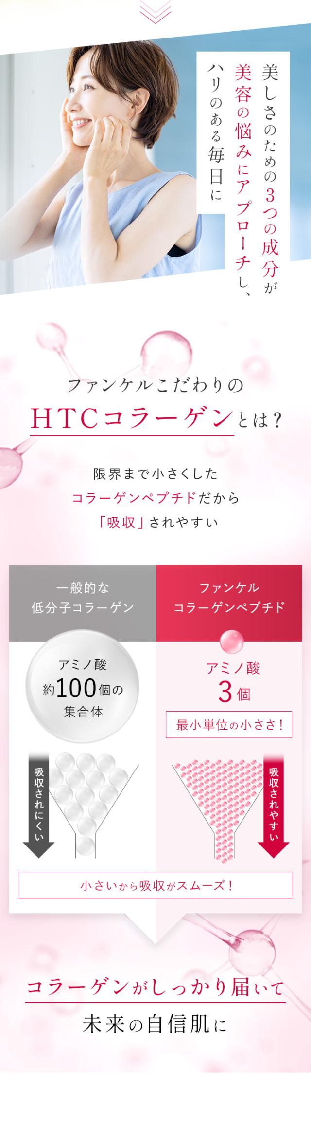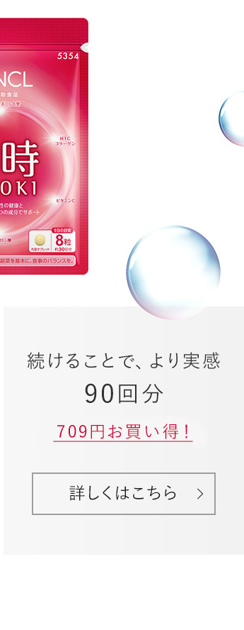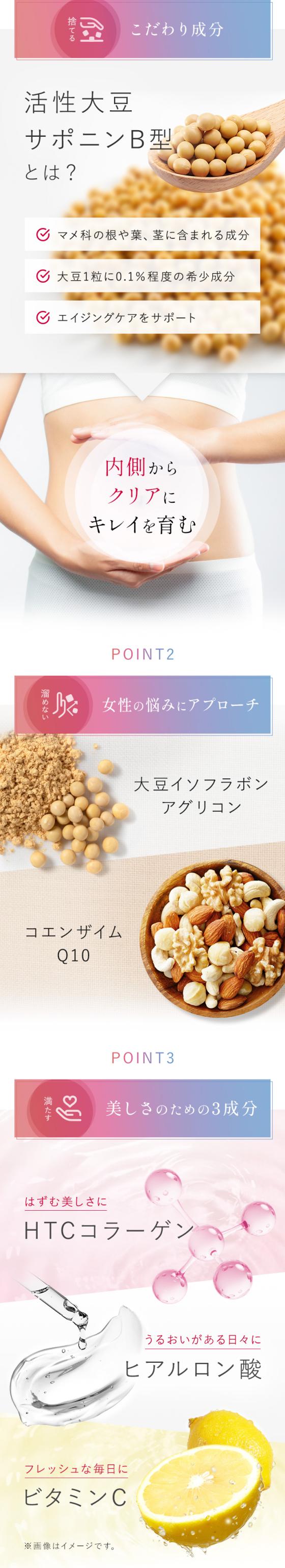 年齢を重ねるごとに溜まりやすくなる老化物質に着目した「活性大豆サポニンB型」を配合。さらにコエンザイムQ10、ビタミンC、大豆イソフラボンを配合。また、HTCコラーゲン、ヒアルロン酸を贅沢に配合し、新しく生み出す力を高めます。ハリのある毎日と女性ならではの健康にアプローチします。