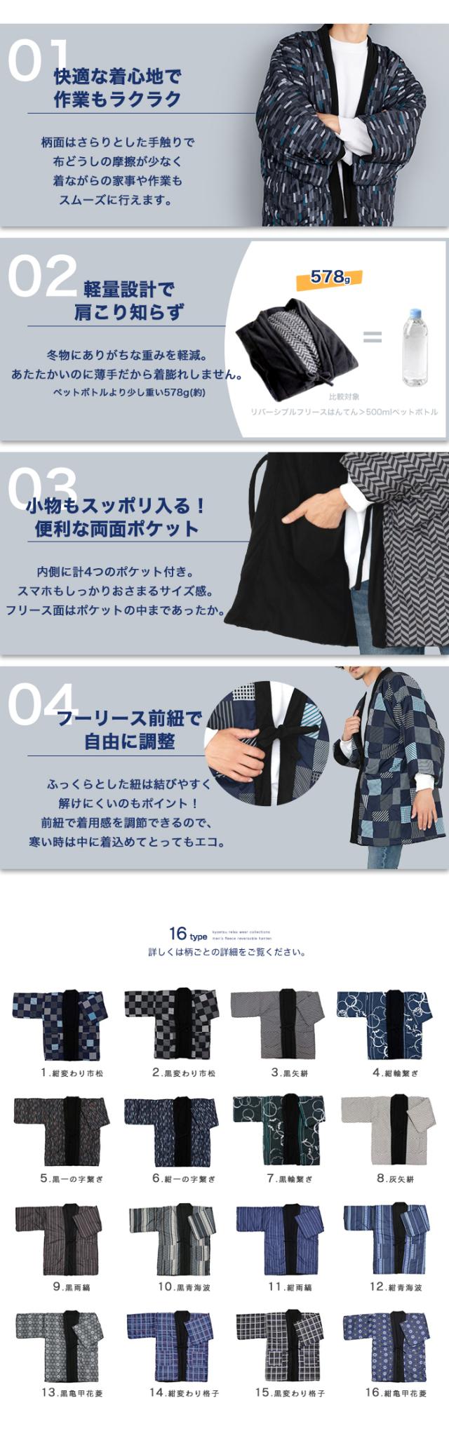 カジュアルな和柄プリントとフリース生地のリバーシブル半纏です。