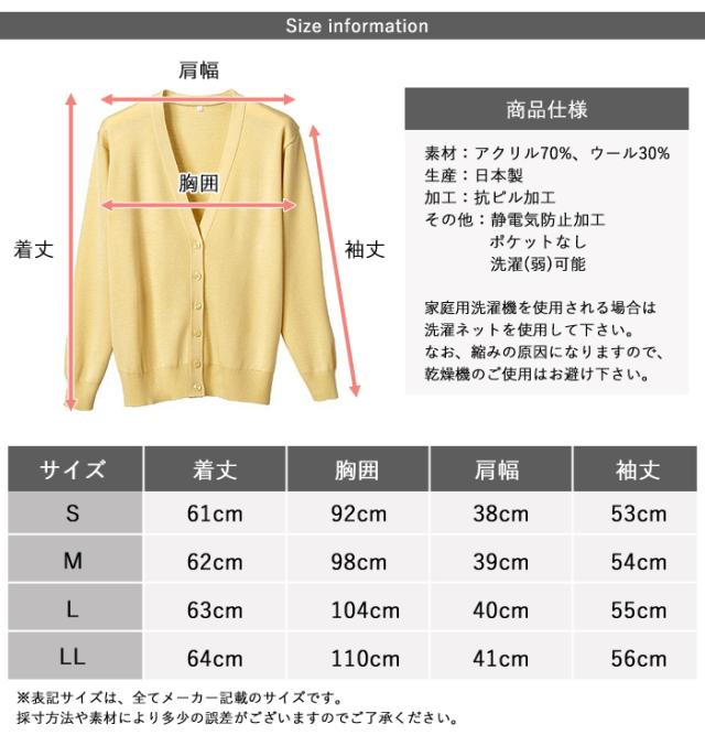 こちらはS〜LLサイズのページとなります 日本製、毛玉ができにくい抗ピル加工の柔らかな肌触りのカーディガン。 ウール混のあったか素材で、白衣や制服の上からも羽織りやすいゆったりシルエット。 洗濯可能でいつでも衛生的に安心して着用できます。 ■サイズ:S〜LL ※サイズにつきましてはメーカー表記サイズとなります。 詳細は商品画像をご確認下さい。 ■素材:アクリル70%、ウール30% ■加工:抗ピル加工 ■その他:静電気防止加工 ポケットなし 洗濯(弱)可能 ■生産国:日本 <注意事項> ※家庭用洗濯機を使用される場合は洗濯ネットを使用して下さい。 なお、縮みの原因になりますので、乾燥機のご使用はお避け下さい。 ※お客様のご覧になられますパソコン機器及びモニタなどの違いにより、実際の商品素材の色と相違する場合もありますのでご了承下さい。 ※モデル着用写真は屋内外での撮影の為、光の影響等で実際のカラーとは異なる場合がございます。【2108】 |