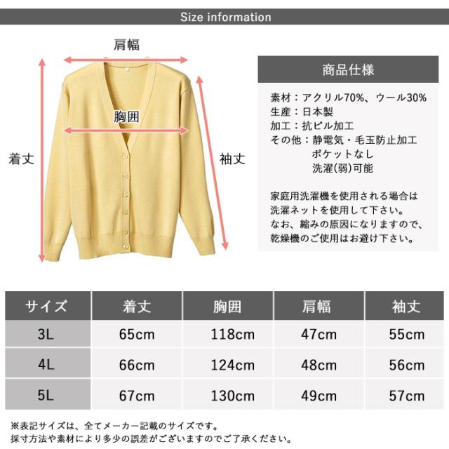 こちらは3L〜5Lサイズのページとなります 日本製、毛玉ができにくい抗ピル加工の柔らかな肌触りのカーディガン。 ウール混のあったか素材で、白衣や制服の上からも羽織りやすいゆったりシルエット。 洗濯可能でいつでも衛生的に安心して着用できます。 ■サイズ:3L〜5L ※サイズにつきましてはメーカー表記サイズとなります。 詳細は商品画像をご確認下さい。 ■素材:アクリル70%、ウール30% ■加工:抗ピル加工 ■その他:静電気防止加工 ポケットなし 洗濯(弱)可能 ■生産国:日本 <注意事項> ※家庭用洗濯機を使用される場合は洗濯ネットを使用して下さい。 なお、縮みの原因になりますので、乾燥機のご使用はお避け下さい。 ※お客様のご覧になられますパソコン機器及びモニタなどの違いにより、実際の商品素材の色と相違する場合もありますのでご了承下さい。 ※モデル着用写真は屋内外での撮影の為、光の影響等で実際のカラーとは異なる場合がございます。【2101】 |