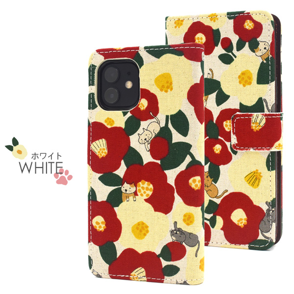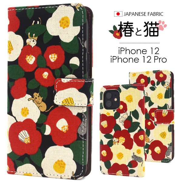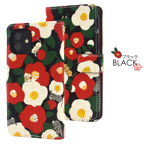 スマートフォンケース iPhone12 iPhone12Pro用 手帳型 猫柄 可愛い キュート 椿と猫 にゃんこ 猫 猫模様 カジュアル 装着簡単 和風 和柄 お洒落 カジュアル スマホケース 横開き オシャレ SoftBank au docomo おしゃれ にゃんこグッズ