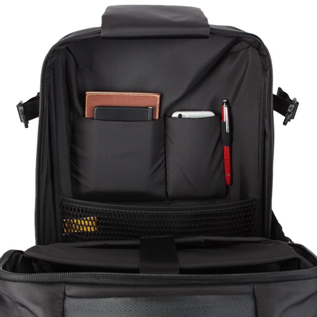 前面側上部にはペンホルダー×1とオープンポケット×2を配置。旅行では意外とペンが必要です。