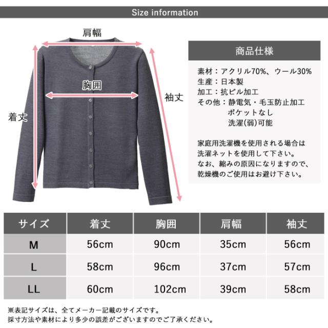 日本製、毛玉ができにくい抗ピル加工の柔らかな肌触りのカーディガン。 首元がすっきり見える丸首デザイン。 ボタン数も多く、しっかり着られます。 家庭用洗濯機で洗うことができ、毎日衛生的に着用できます。 ■サイズ:M〜LL ※サイズにつきましてはメーカー表記サイズとなります。 詳細は商品画像をご確認下さい。 ■素材:アクリル70%、ウール30% ■加工:抗ピル加工 ■その他:静電気防止加工 ポケットなし 洗濯(弱)可能 ■生産国:日本 <注意事項> ※家庭用洗濯機を使用される場合は洗濯ネットを使用して下さい。 なお、縮みの原因になりますので、乾燥機のご使用はお避け下さい。 ※お客様のご覧になられますパソコン機器及びモニタなどの違いにより、実際の商品素材の色と相違する場合もありますのでご了承下さい。 ※モデル着用写真は屋内外での撮影の為、光の影響等で実際のカラーとは異なる場合がございます。【2101】 |