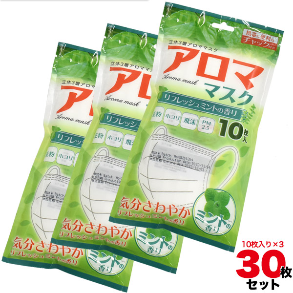 訳あり品 マスク 30枚セット 使い捨て アロママスク リフレッシュミント 不織布 立体3層 ますく 大人用 10枚 3個セット 感染予防 ウイルス対策 アロマ ミント 香り付き 消耗品 飛沫対策 花粉 風邪予防 通勤 通学 移動 旅行 外出 買い物 接客 業務用 会社 男女兼用 埃 乾燥