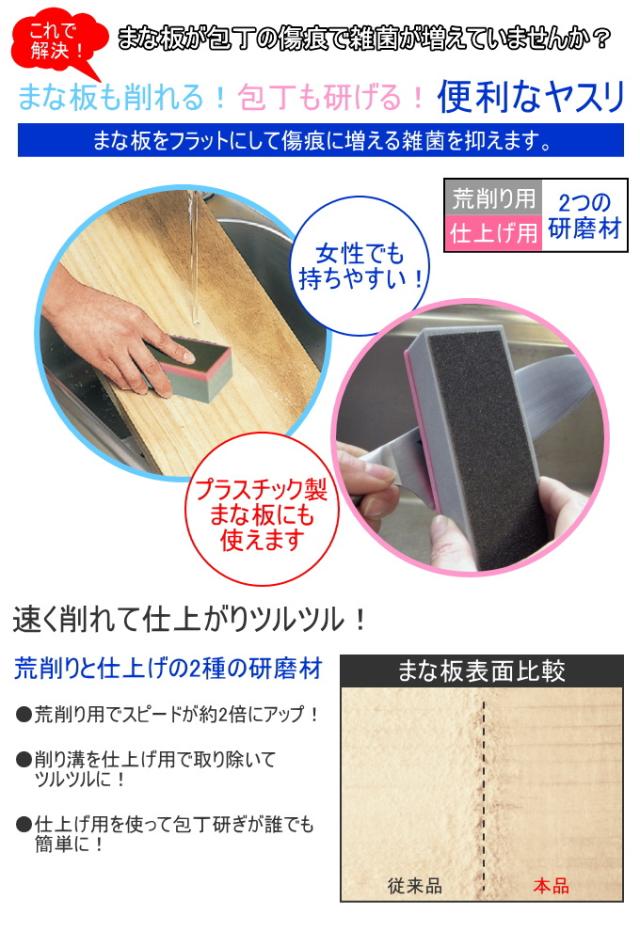 | 特徴 | これ1つでまな板も削れ、包丁も研げる便利なヤスリ! まな板をフラットにして傷跡に増える雑菌を抑えます。 グレー部分がまな板(粗削り)とピンク部分が包丁研ぎ用・まな板(仕上げ)になります。 女性でも持ちやすい、細みサイズ。 プラスチック製のまな板でも使用できます。 |