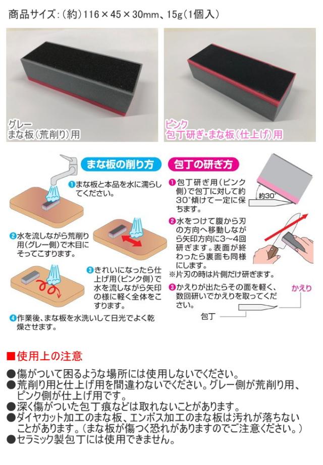 | 注意 | 傷がついて困るような場所には使用しないでください。 荒削り用と仕上げ用を間違わないでください。グレー側が荒削り用、ピンク側が仕上げ用です。 傷の心配がある場合は、部分的にこすって試してください。 研磨部分がすり減ったら新しいものをお買い求めください。 深く傷がついた包丁痕などは取れないことがあります。 火のそばに近づけないでください。 ダイヤカット加工のまな板、エンボス加工のまな板は汚れが落ちないことがあります。 セラミック製包丁には使用できません。 |