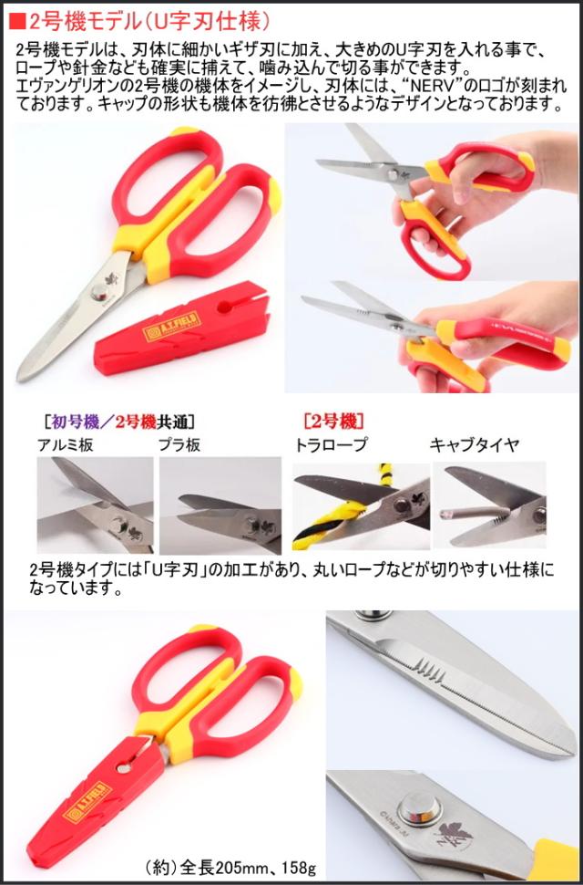 | 特徴 | エヴァンゲリオンと創業70年の老舗刃物メーカーがコラボした、タフでファッショナブルなクラフトハサミです。 刃物の町岐阜県関市の刃物職人が1本1本丁寧に刃付けをした切れ味抜群の商品です。 ハンドル部に機体番号、刃体部にNERVマークを印字し、エヴァンゲリオンの世界観を表現。 初号機モデルは、刃体に細かいギザ刃を入れたセレーション加工により、切るものを逃しにくく、じゅうたんやアラミド繊維などもしっかりと挟み込んで切る事ができます。 デザインは、エヴァンゲリオンの初号機をイメージした紫と緑をカラーに取り入れております。 2号機モデルは、刃体に細かいギザ刃に加え、大きめのU字刃を入れる事で、ロープや針金なども確実に捕えて、噛み込んで切る事ができます。 デザインは、エヴァンゲリオンの2号機をイメージした赤と黄をカラーに取り入れております。 両モデルとも安全に携帯できるよう、キャップも付いております。工具箱に収納する際もハサミの先端を傷つけることなく、安心して持ち運ぶことができます。 初号機モデル、2号機モデルの2種類からお選びください。(それぞれ刃の仕様が異なりますのでご注意ください。) ※WEB画像と実物では色合い等異なる場合がございますがご了承ください。 |