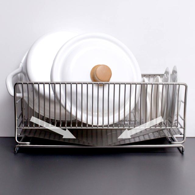 傾斜付きの排水トレーで、お皿から落ちた水がシンクへスムーズに流れ落ちます。水が溜まらないので、面倒な水捨てが不要です。トレーは取り外せるのでお手入れが簡単で、いつも衛生的にお使いいただけます。
