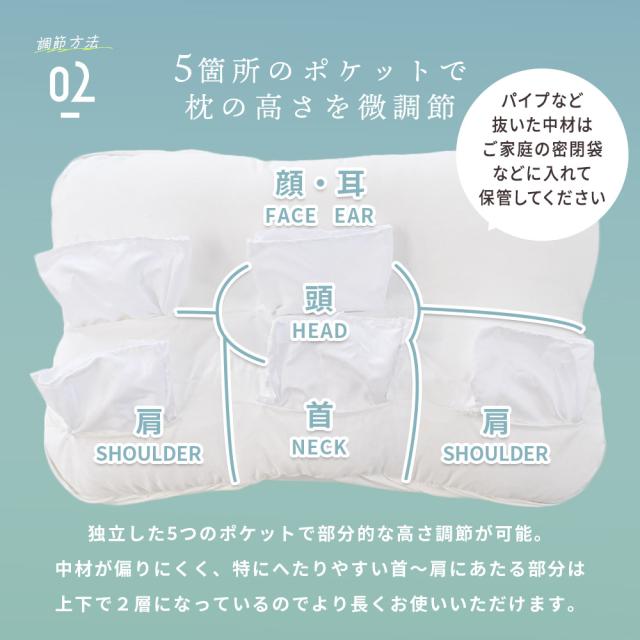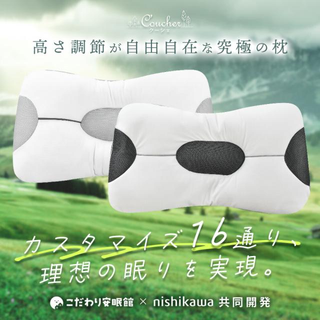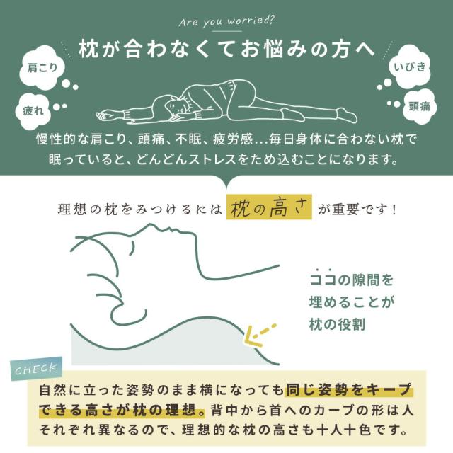 | ・快眠の決め手はまくらの「高さ」 肩こりや頭痛・不眠の原因の一つに、枕が合っていないという可能性があります。毎日高さの合わない枕で眠っていると、首や肩にどんどんストレスをため込むことになります。枕は高すぎても低すぎても身体に不具合が起こるので、 自分に合った枕の高さを知ることが大切です。 ・枕を選ぶポイントは?「高さが身体に合っている」ことの他にも、「寝返りがしやすい」、「横向きに寝ても苦しくない」、「通気性がよく頭部が蒸れにくい」ことなども枕を選ぶ際の重要なポイントです。以上の4つのポイントを抑えた枕を選びましょう。 ・クーシェは高さ調節が自由自在!クーシェは5つに分かれたポケットから中材を出し入れすることで、セミオーダー枕並みの細かな高さ調整が可能!ざっくりとした調整はウレタンシートを抜き差しするだけでOK!また、仰向け・横向きでも後頭部と頸椎を支える立体構造で自然な寝返りをサポート。特に蒸れやすい中央部と両サイドはメッシュ素材なので蒸れを逃がして快適です。 ・こだわり安眠館オリジナル西川と共同開発することで商品のクオリティの向上と低価格化を図りました。試行錯誤を重ね、「より多くの人に自分に合った枕を使って欲しいというこだわりを満たした枕ができ上がりました。店長の自信のある逸品です! | |