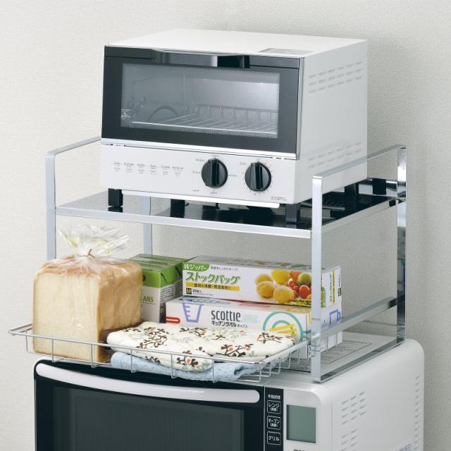 電子レンジ上のスペースを使い、キッチン用品などひとまとめにおける便利なラックです。