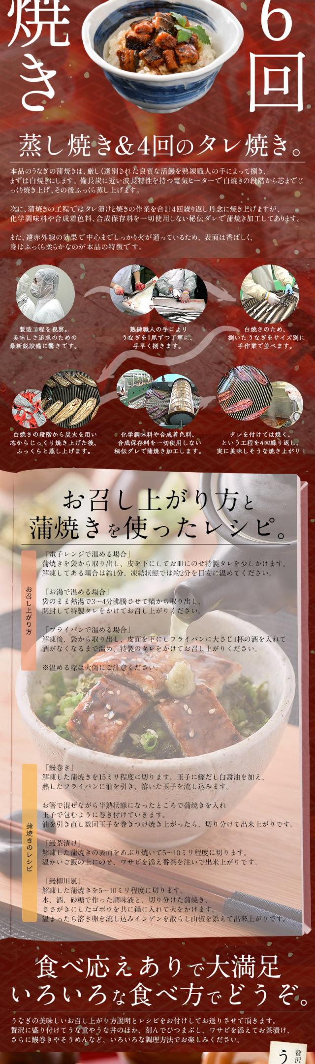 うなぎ蒲焼:うなぎ(鹿児島県産、宮崎県産)、しょうゆ、砂糖、水あめ、みりん、発酵調味料、ぶどう糖果糖液糖、澱粉/増粘剤(加工澱粉)(原料の一部に小麦、大豆を含む)/タレ:しょうゆ、砂糖、発酵調味料(水あめ、米、果糖ぶどう糖液糖、酒精、食塩)、調味料(アミノ酸等)、カラメル色素、増粘多糖類、(原料の一部に小麦、大豆を含む)、山椒末