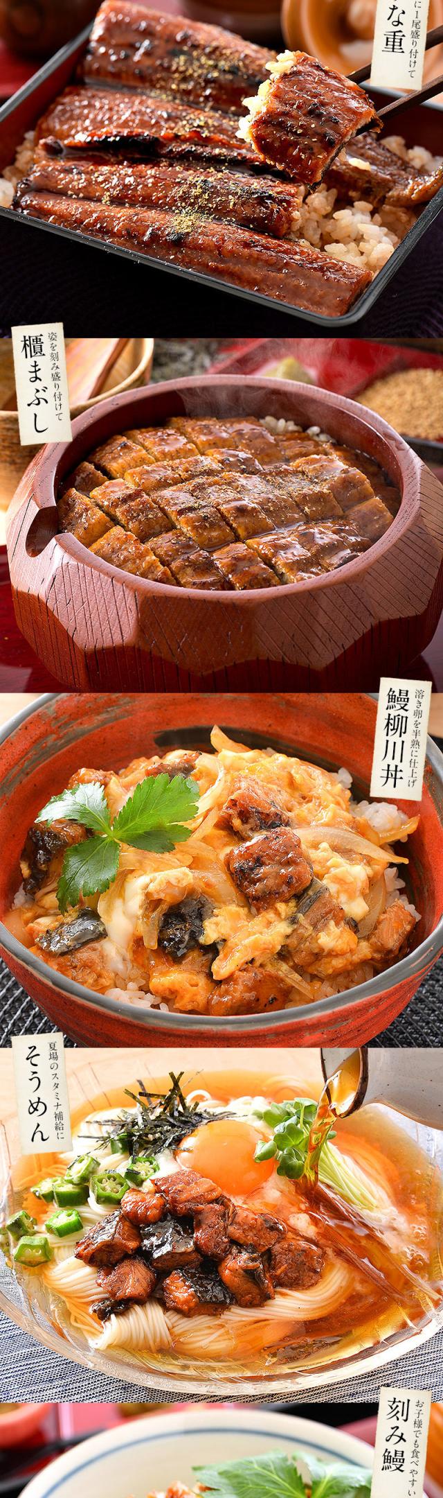 うなぎ蒲焼165g前後×1尾、ハーフカットうなぎ蒲焼き約80g×1袋、刻みうなぎ50g×1袋、タレ&山椒(タレ10g、山椒末0.2g)×2袋