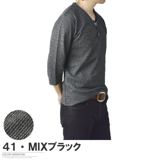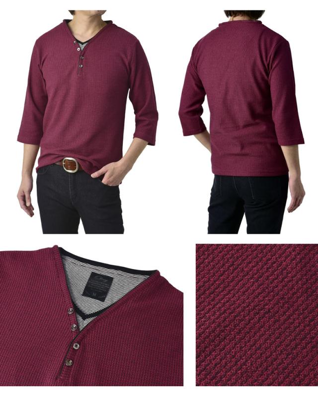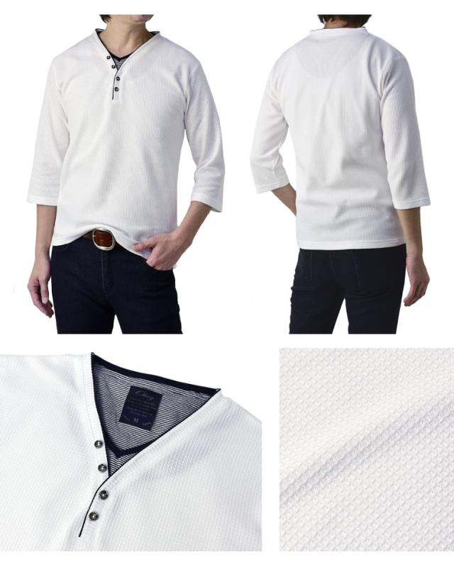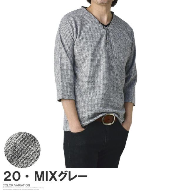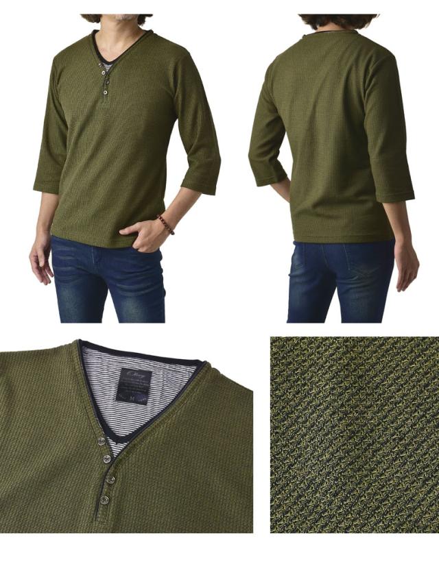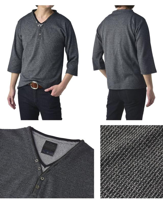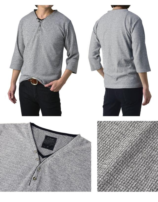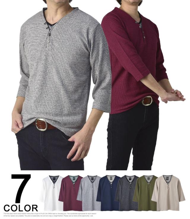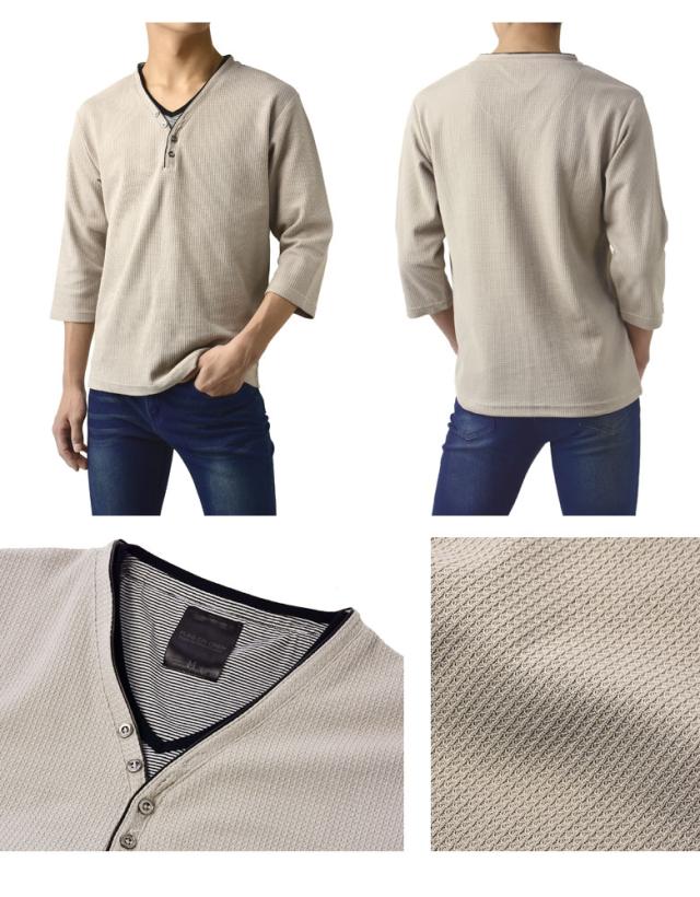 Tシャツ 7分袖 七分袖 畦 ワッフル Y ヘンリー キーネック メンズ カットソー トップス【A6X】【パケ1】