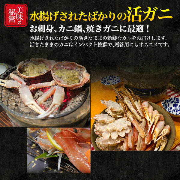活きたままのカニはインパクト抜群で、贈答用にもオススメです。